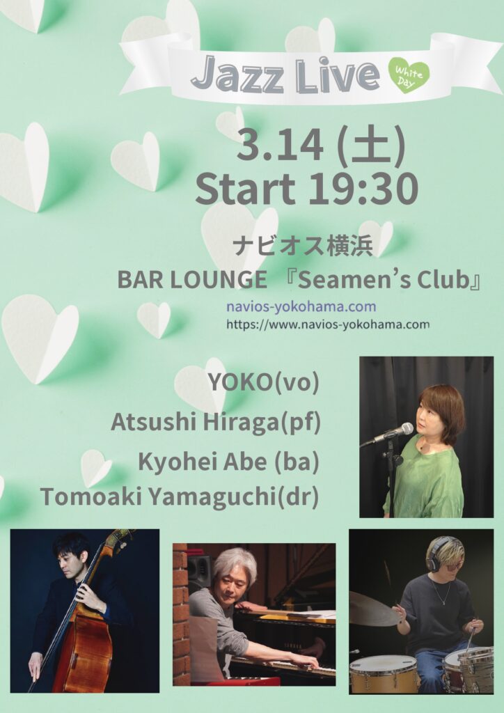 BAR LOUNGE 『Seamen’s Club』 3月14日(土)営業につきましては、JAZZ LIVEのため、19時30分からお一人様500円のミュージックチャージを頂きます。